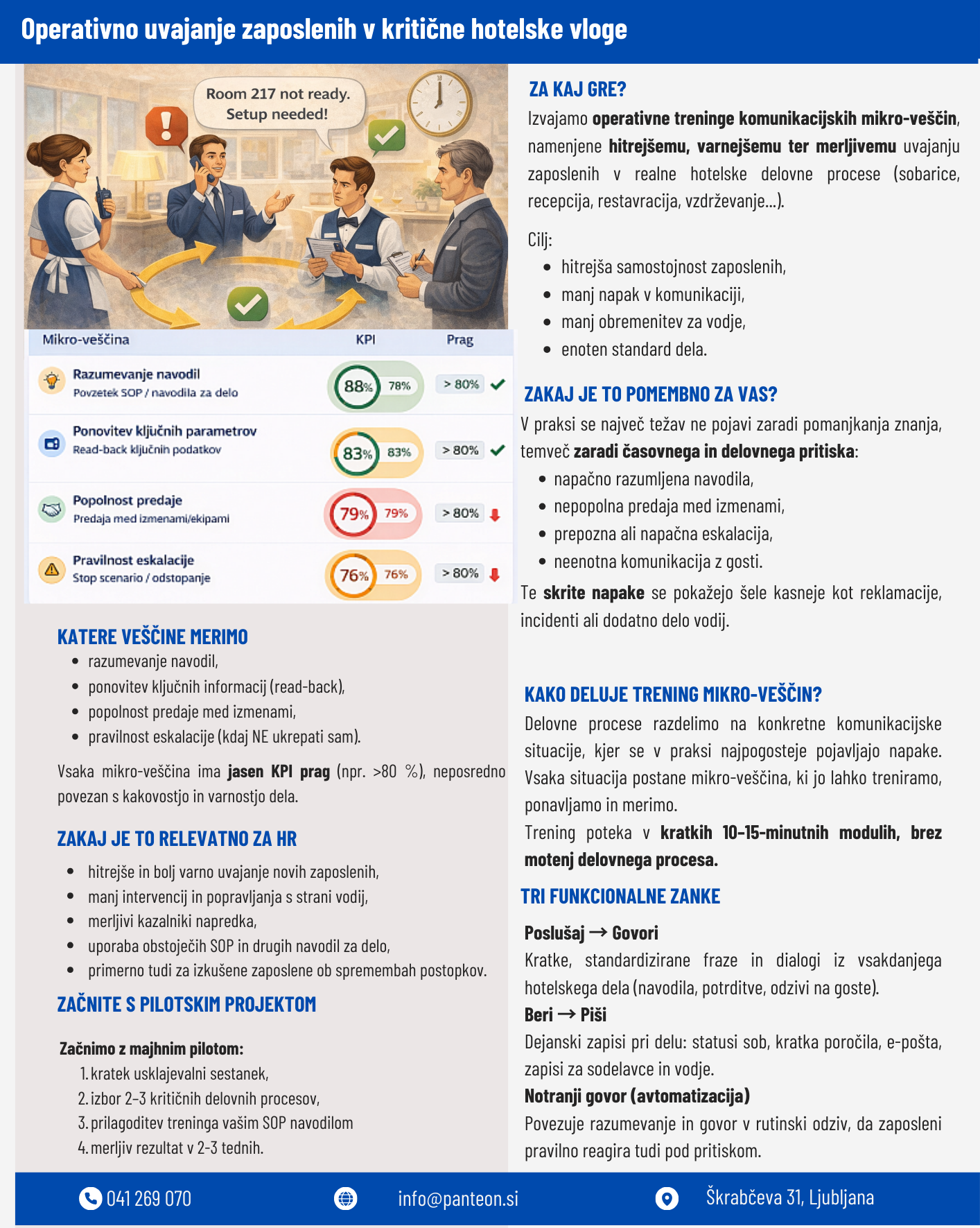Uvajanje v hotelu je pogosto uspešno “na papirju”, v praksi pa se pod časovnim pritiskom hitro pojavijo tihe napake – nejasna predaja, napačna eskalacija, izgubljene informacije in dodatno ponovno delo vodij. Zato izvajamo kratke, operativne treninge komunikacijskih mikro-veščin, povezane z vašimi SOP postopki, ki pospešijo samostojnost zaposlenih in zmanjšajo napake v ključnih situacijah.